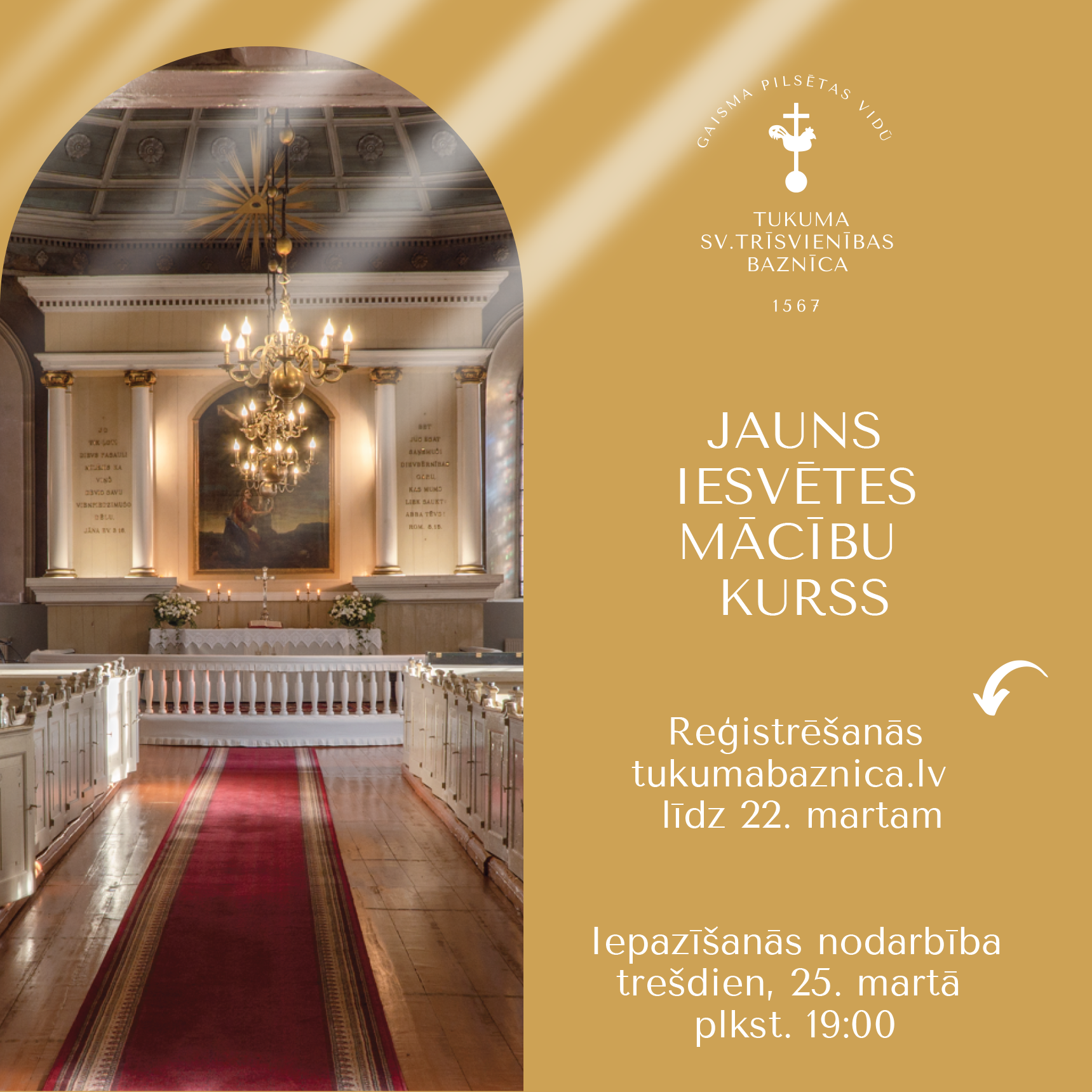 Aicinām pieteikties iesvētes mācībām 2026. gada pavasarī! Mācības iesāksies 18. martā un noslēgsies Vasarsvētkos – 24. maijā ar kristībām un iesvētībām. Reģistrācija draudzes mājas lapā www.tukumabaznica.lv atvērta līdz 15. martam (skatīt reģistrācijas saiti lejā).